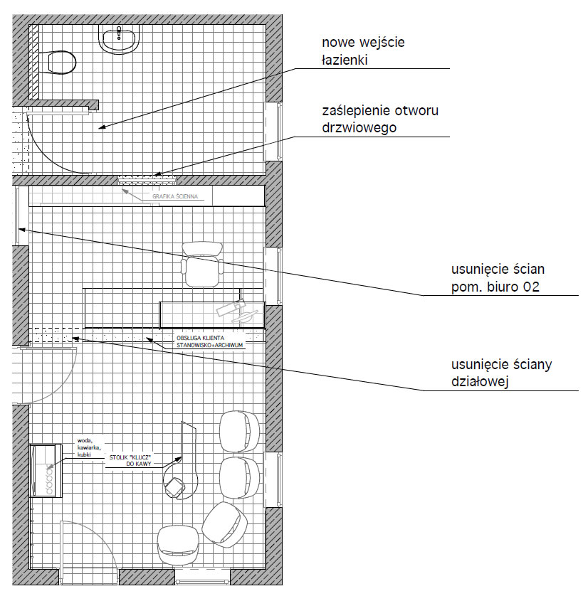 Propozycja nowego układu funkcjonalnego biura obsługi klienta stacji kontroli pojazdów zakłada usunięcie ściany działowej oraz zaślepienie jednego otworu drzwiowego. Nowe wejście do łazienki przez wnękę przedsionka na bezkolizyjne otwarcie drzwi. Dzięki tym zmianom otrzymujemy otwartą przestrzeń z czytelnie wydzieloną strefą klienta – poczekalni oraz punkt obsługi. Stanowisko obsługującego wydzielone dużym biurkiem z nadstawką. Kontuar ma stanowić barierę nie przekraczalną dla klienta. Dodatkową blokadą dla próbujących wejść w strefę obsługującego jest przeszklenie w miejscu obecnych drzwi do części socjalnej – pracownicy warsztatu będą mieli wgląd w to co dzieje się w punkcie obsługi klienta. Transparentność tej przestrzeni wzmocni wymiana drzwi z warsztatu na szklane.